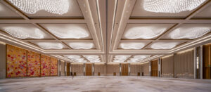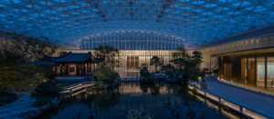 3階のランチホール、サミットホール、バンケットホールは多様な機能に対応しており、屋上庭園にも繋がりを持たせています。中国式庭園「蘇園(そえん)」は、内部から漏れ出る光によって古典的なシルエットを浮かび上がらせ、古今の美が織りなす絵巻のような風景を描き出しました。光はもはや単なる照明ではなく、建築と自然、歴史と現代の間に静かに交わされる対話そのものとなっています。